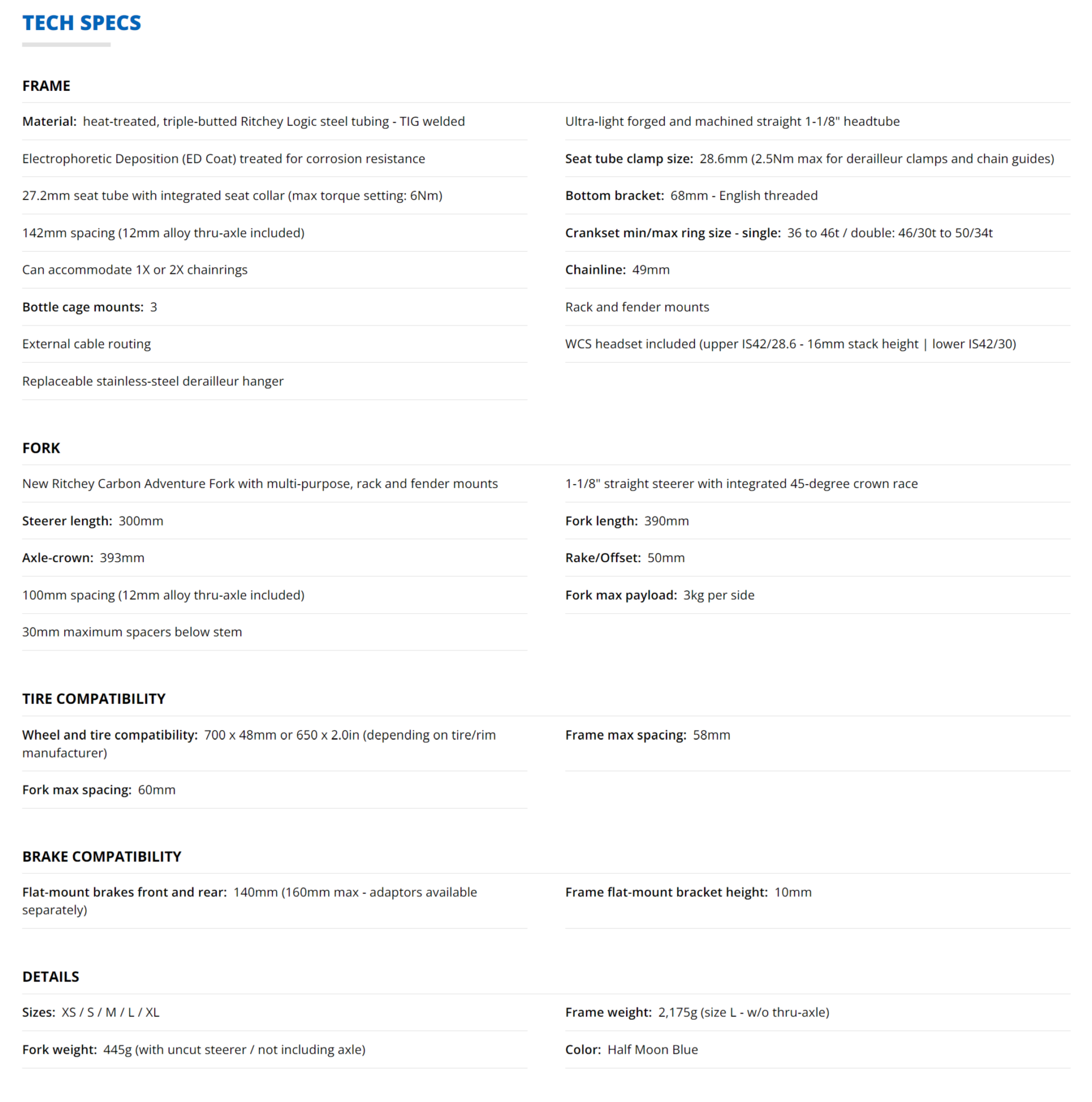 Khung xe đạp Ritchey Outback Di2 Frameset là phiên bản cải tiến để có thể sử dụng groupset bằng điện của Shimano. Ngoài tính thẩm mỹ tuyệt vời của chiếc Outback này, bộ khung vẫn giữ lại mọi thứ nổi tiếng trước đó. Nó có một số tính năng thiết thực, mang đến cho người lái khả năng đi trọn hành trình trong thời gian dài. Khung xe có phần bắt ốc vít giúp bạn gắn baga một cách dễ dàng, tương thích với nhiều loại baga khác nhau có trên thị trường. Bên cạnh đó bạn có thể gắn được cả chắn bún. Với loại khung này bạn có thể lắp lốp 700c x 48mm hoặc 650b x 2″. Outback sử dụng flat-mount, phuộc xe đạp được làm bằng sợi carbon. Khung xe được hàn TIG một cách tỉ mỉ với ống thép triple-butted Ritchey Logic độc quyền.