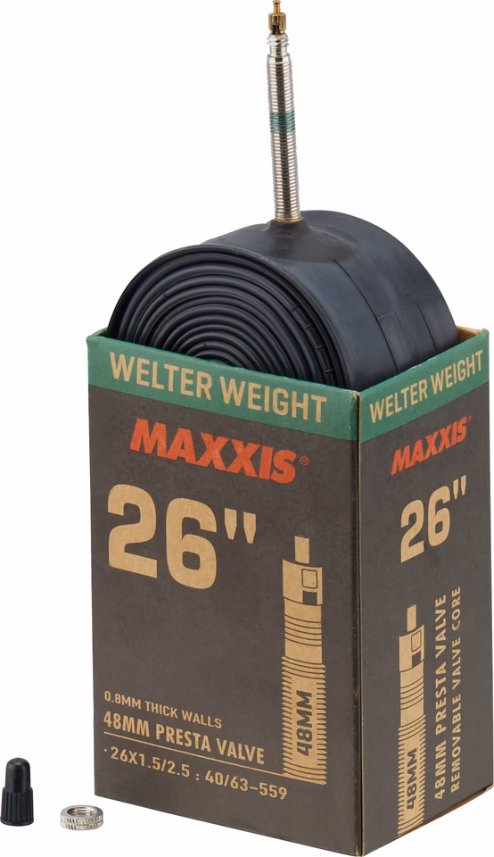Ruột/Săm Xe Đạp Maxxis 26 x 1.5/2.5 Van Pháp F/V 48mm là loại ruột dùng cho vành xe đạp 26 inch sử dụng van pháp. Nó tương thích với lốp/vỏ xe đạp từ 1.5 inch đến 2.5 inch. Loại ruột Welter Weight này được chế tạo từ vật liệu chất lượng, giúp tăng cường khả năng chống thủng và duy trì áp lực lâu dài.
