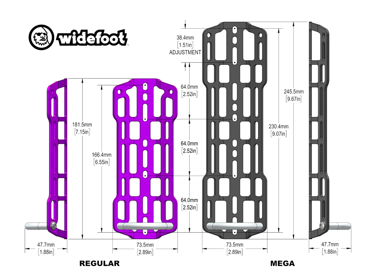 Widefoot Cargo Mount v2 được làm từ nhôm 5052 bền và nhẹ, cage này có lớp ngoài anodized màu Đen, Bạc, Tím và Cam. Regular size chỉ nặng 78g với load support, trong khi phiên bản Mega nặng 98g, khiến nó trở thành một trong những cage chở hàng nhẹ nhất hiện có.